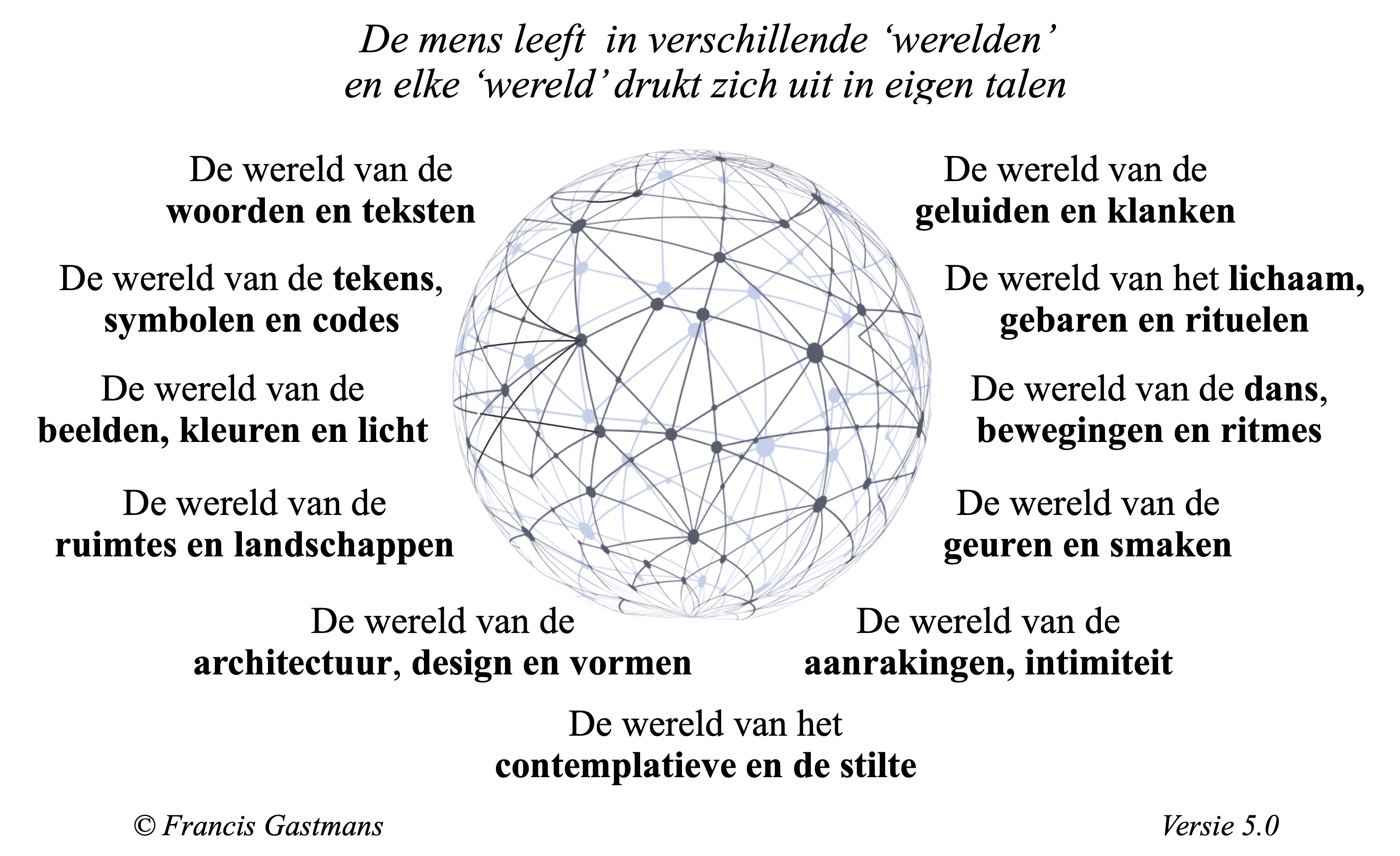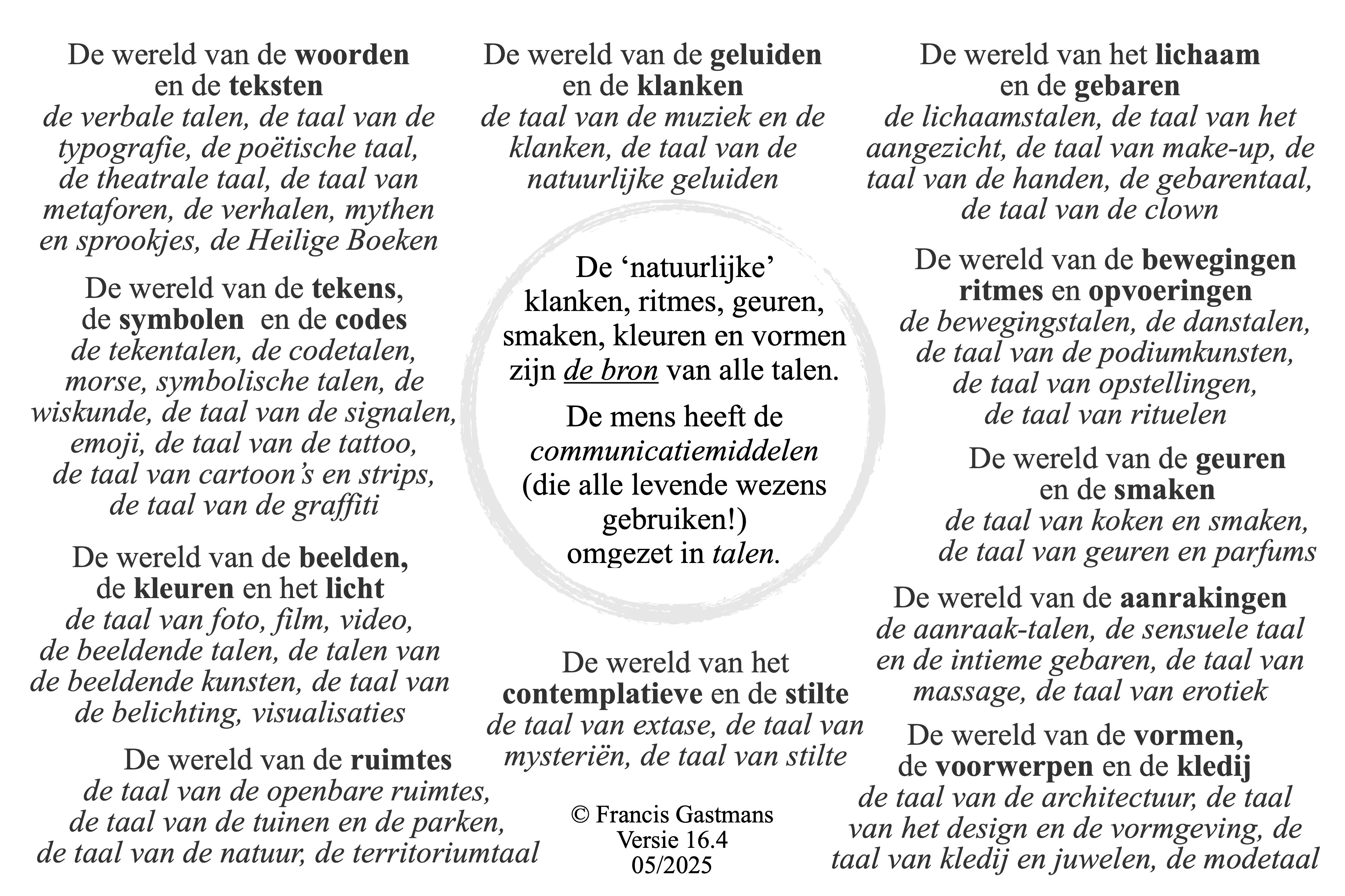 Je inspanningen beperken zich daarbij meer dan waarschijnlijk tot woorden, tot een woordentaal (gesproken of geschreven). Je doet geen beroep op een of meer van de tien andere mogelijke talen. Om werkelijk te kunnen begrijpen – jezelf, een ander, een situatie, een gebeurtenis – heb je meerdere talen nodig.(2)