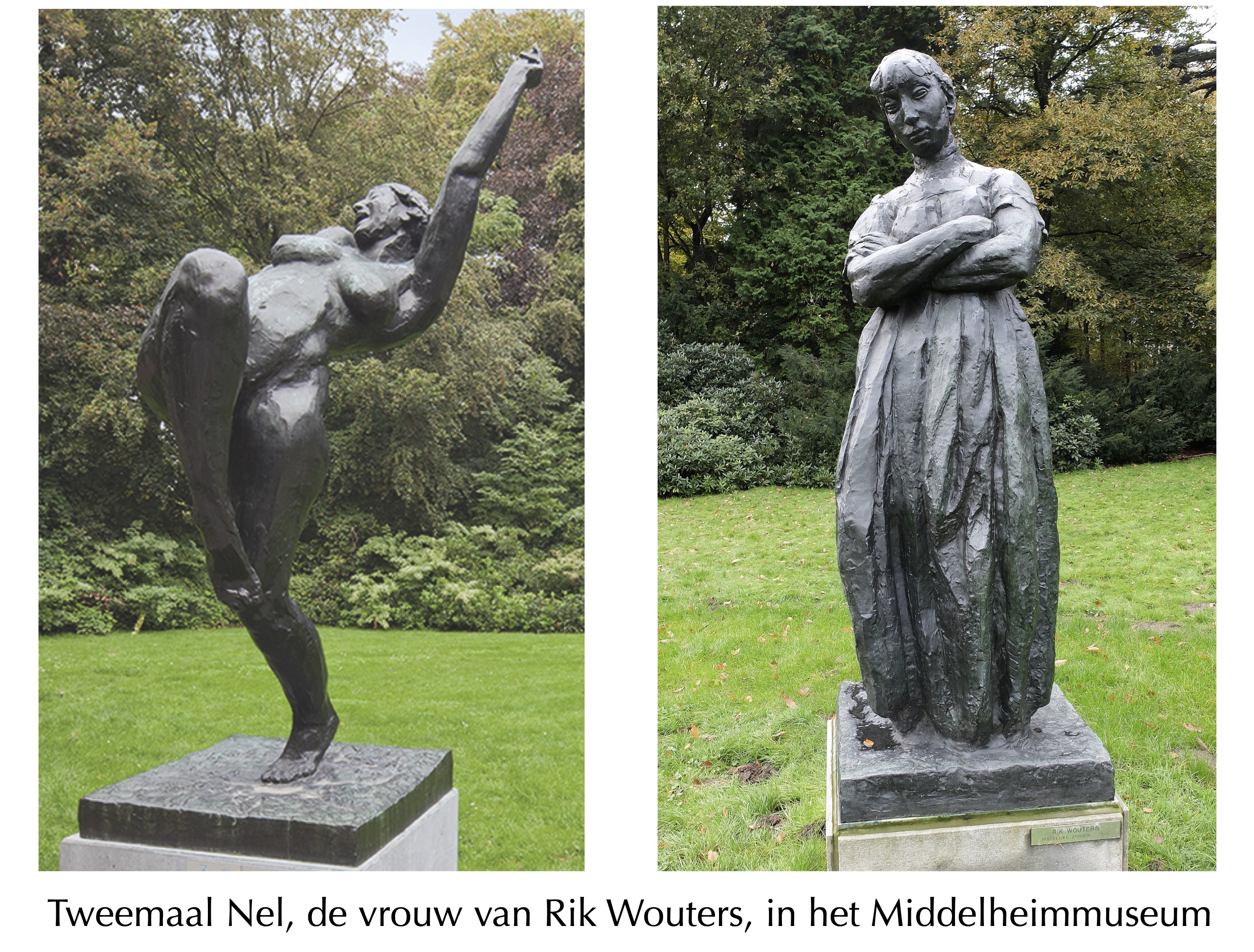 Illustratie: de beelden staan in Antwerpen, het Middelheimmuseum, in het gedeelte ‘Menselijke natuur’ (M11 en M12), meer dan de moeite waard.