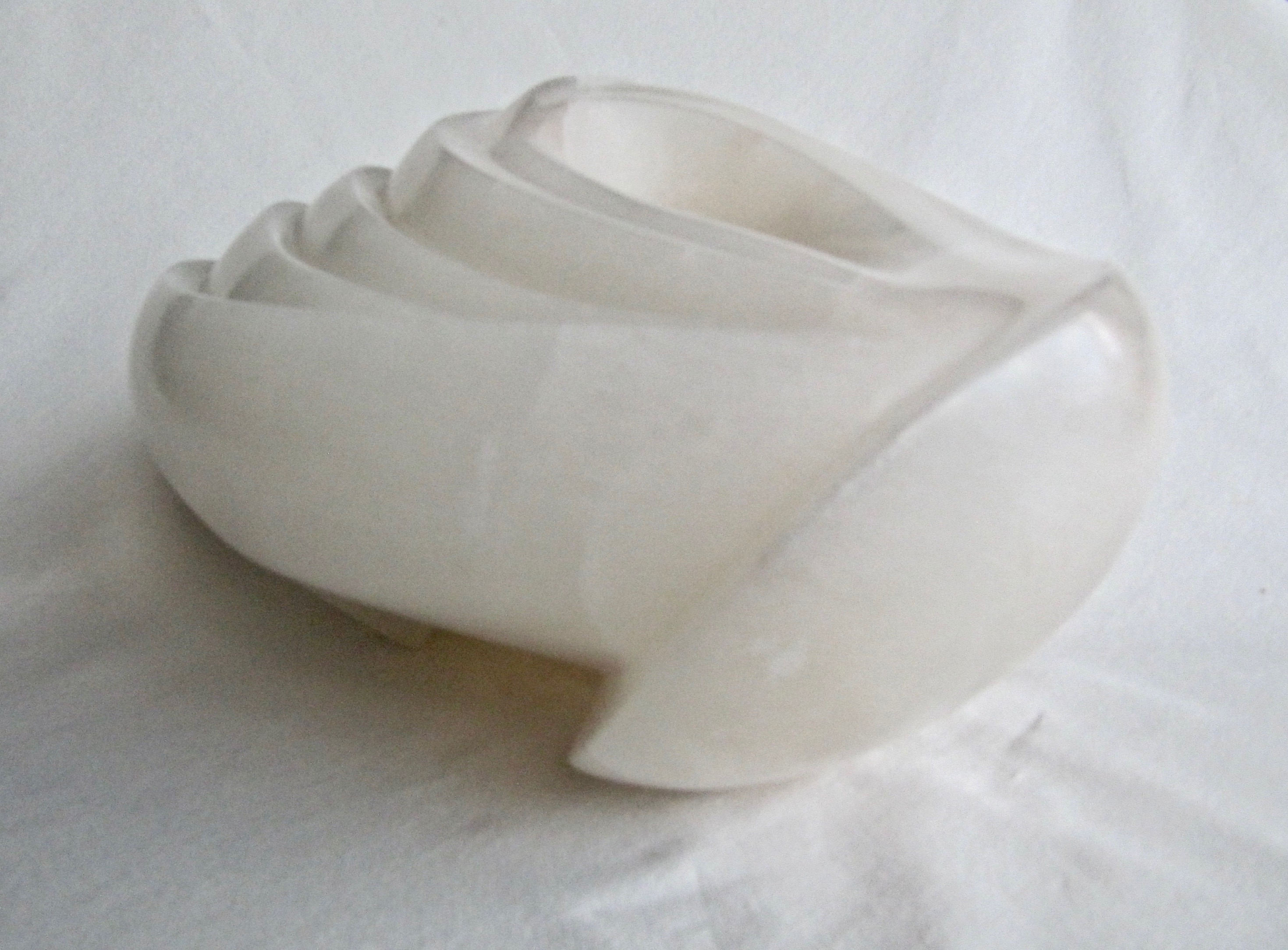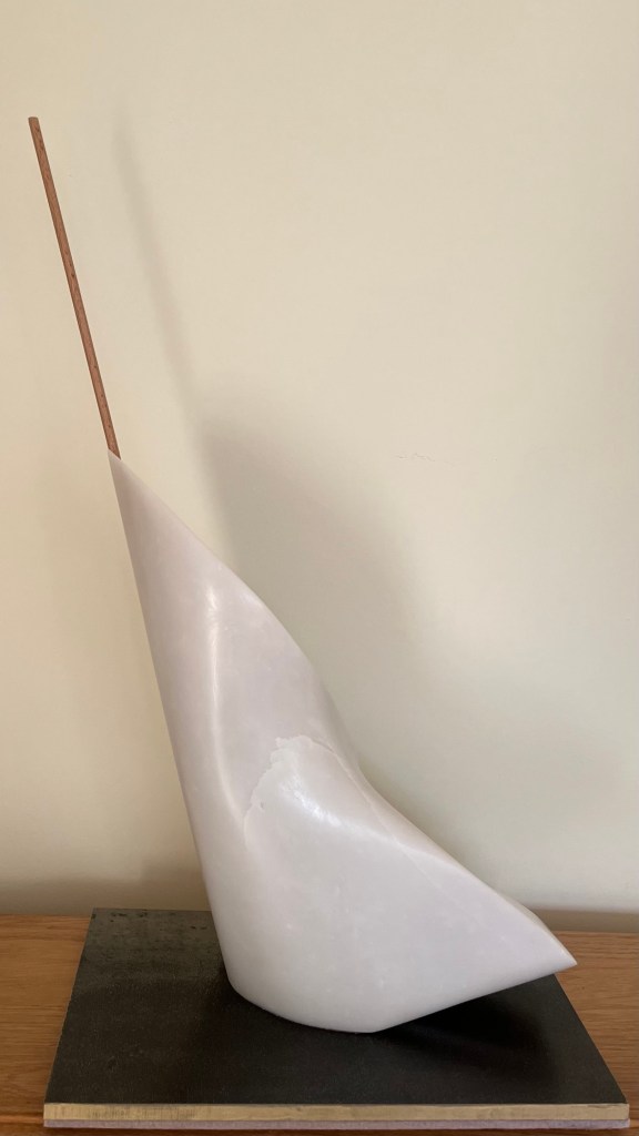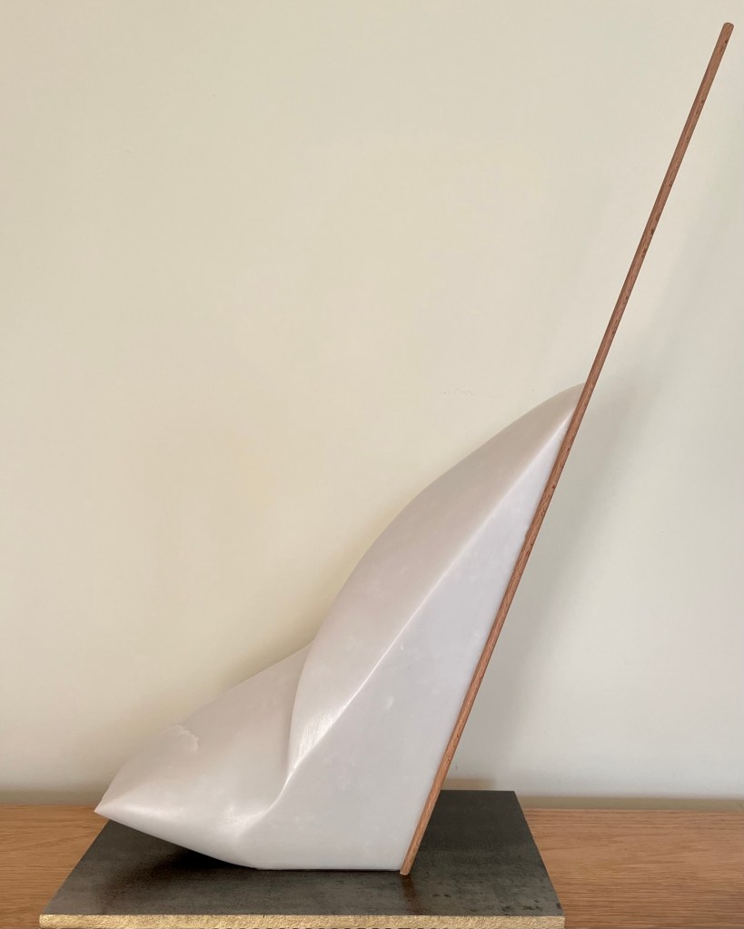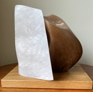 Maart 2024 – kalksteen uit Pakistan (voetstuk), een tak van een beuk, een witte albast (hoogte 140 cm)