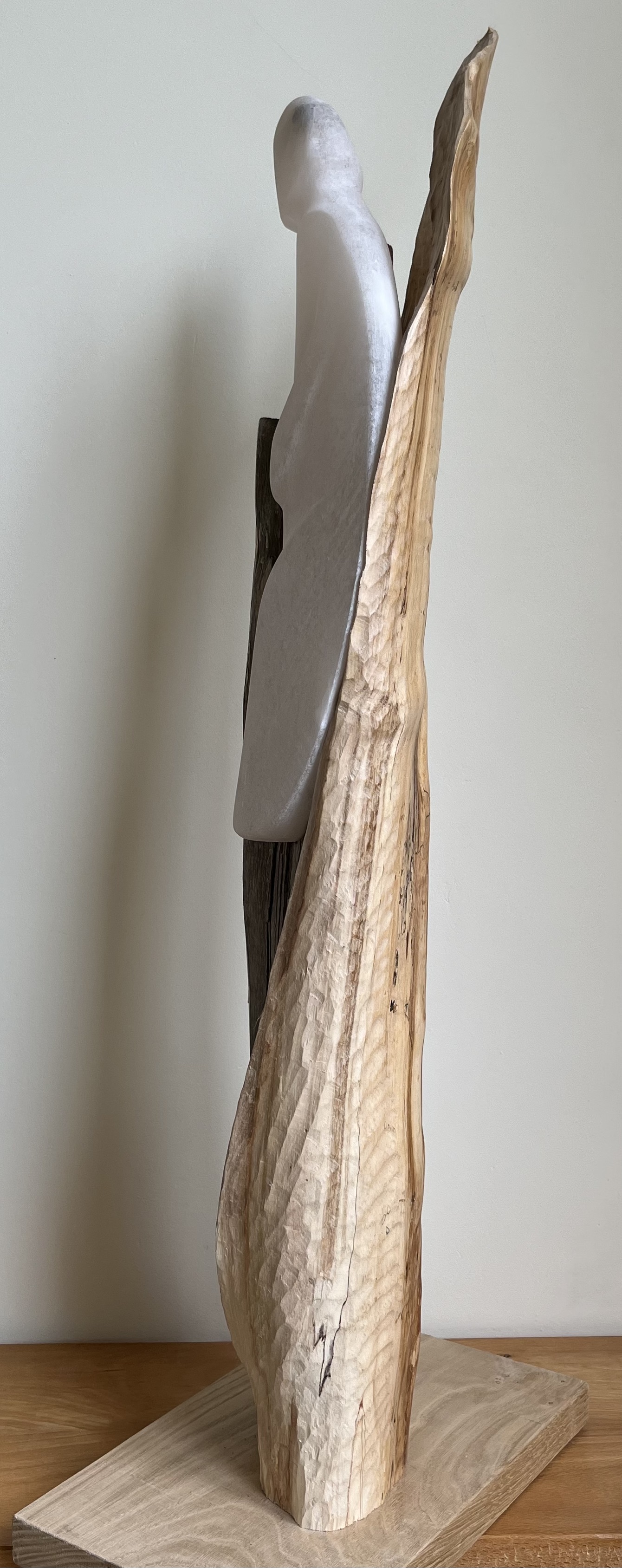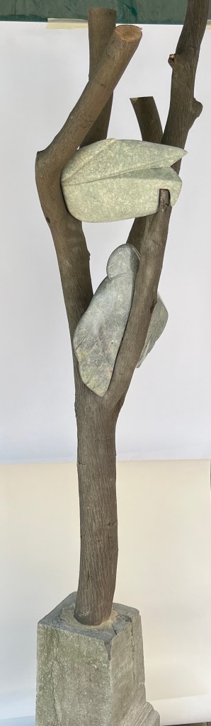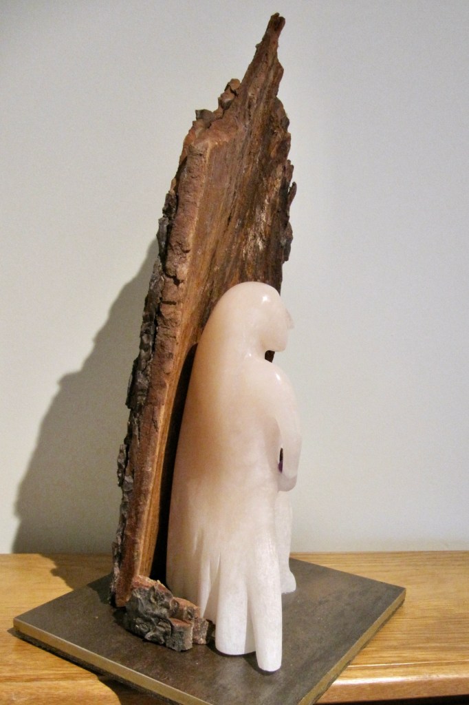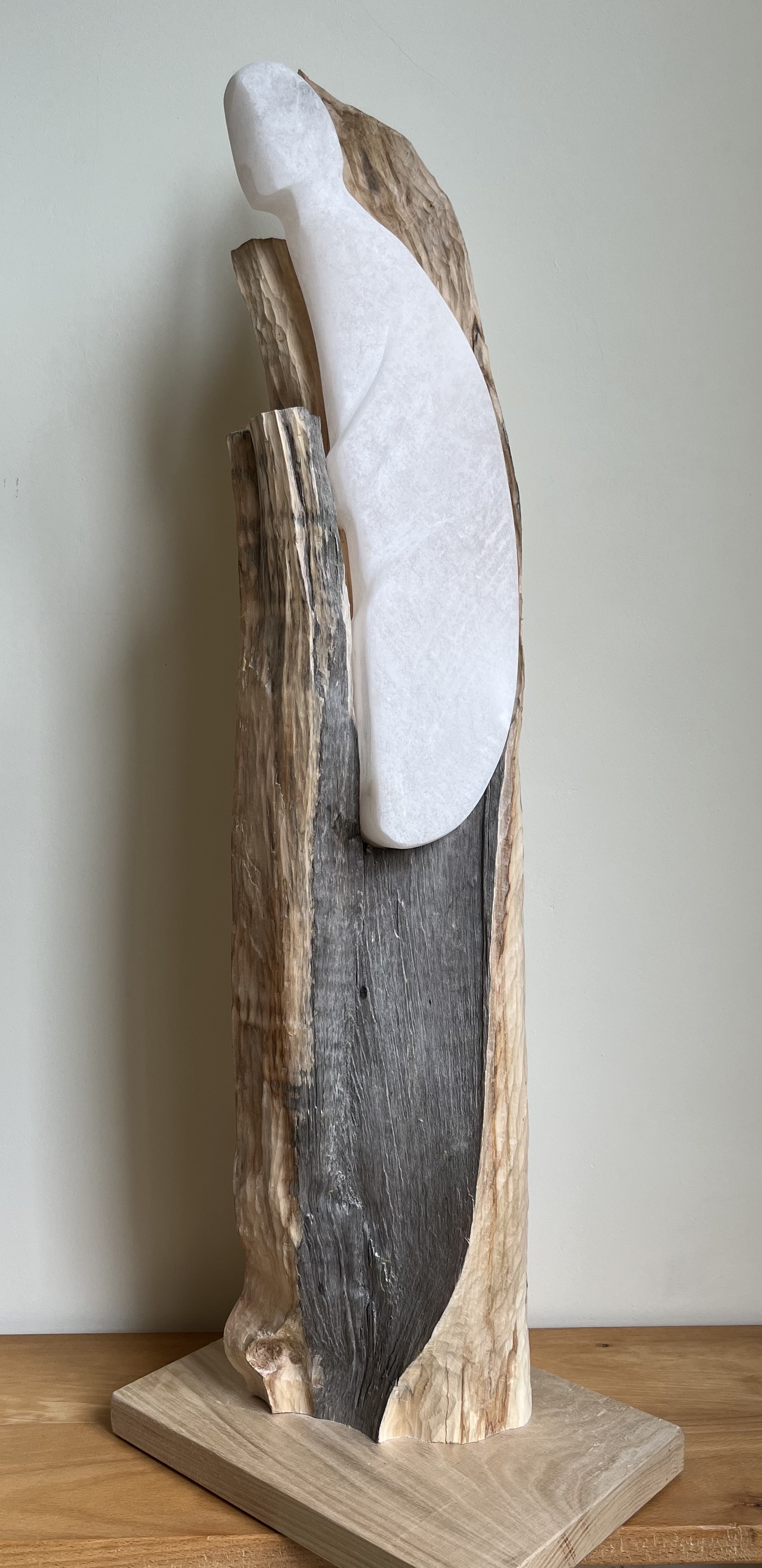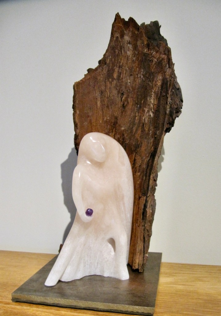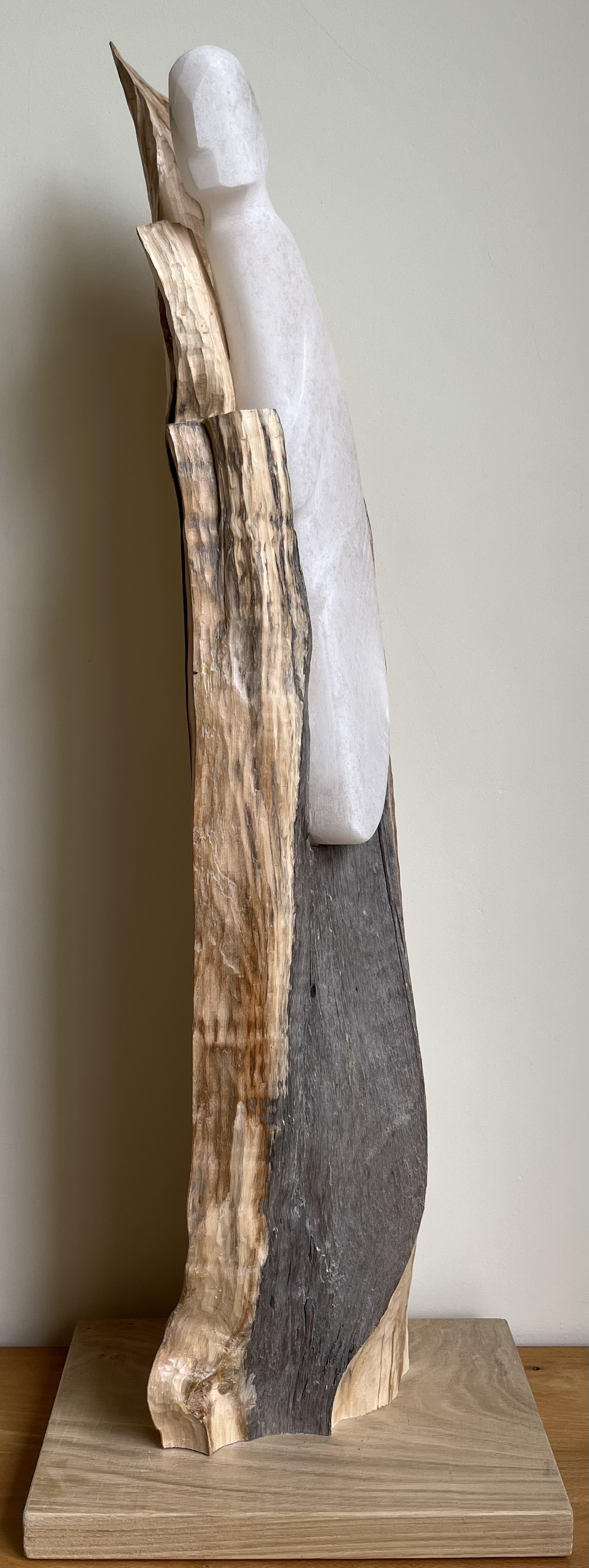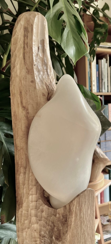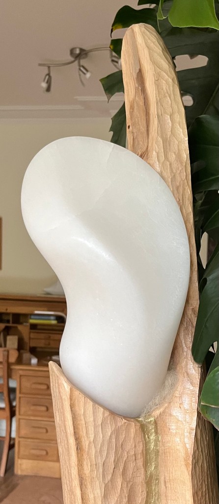 Augustus 2024 – Steen: witte albast met roze spikkels – Hout: tak van een beuk – Voet: acacia – Totale hoogte 112 cm