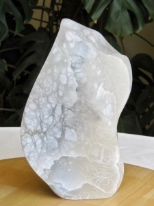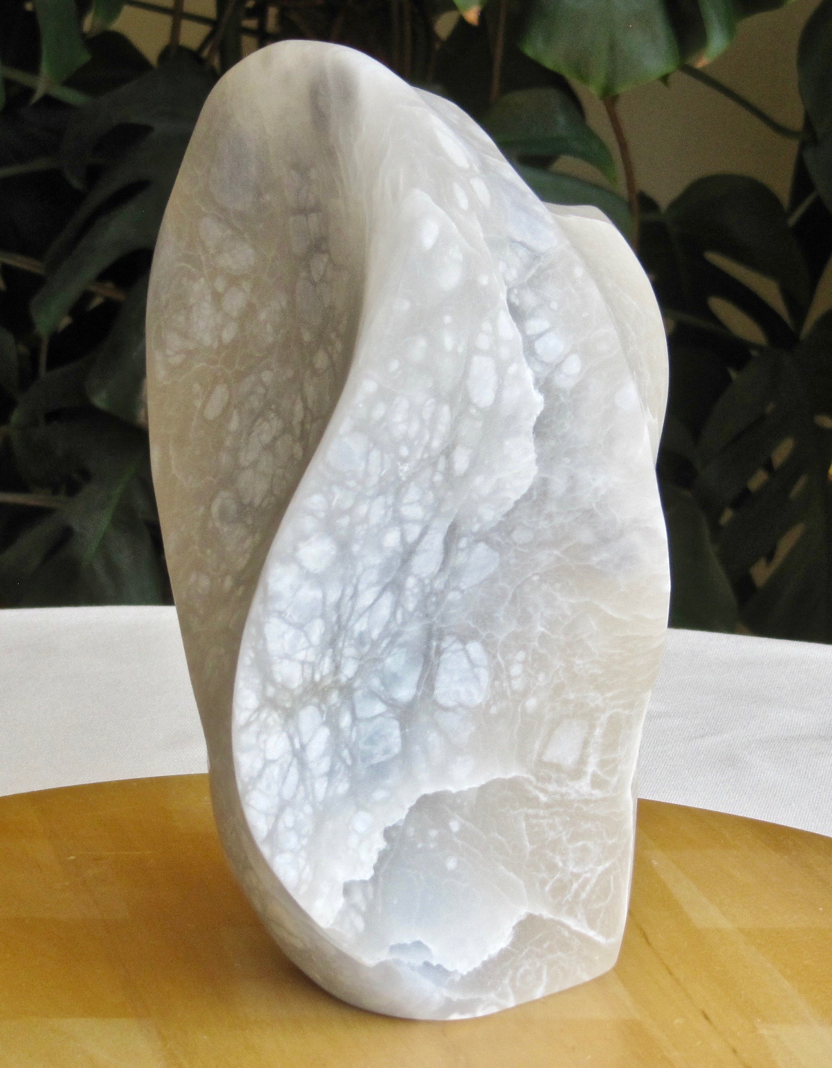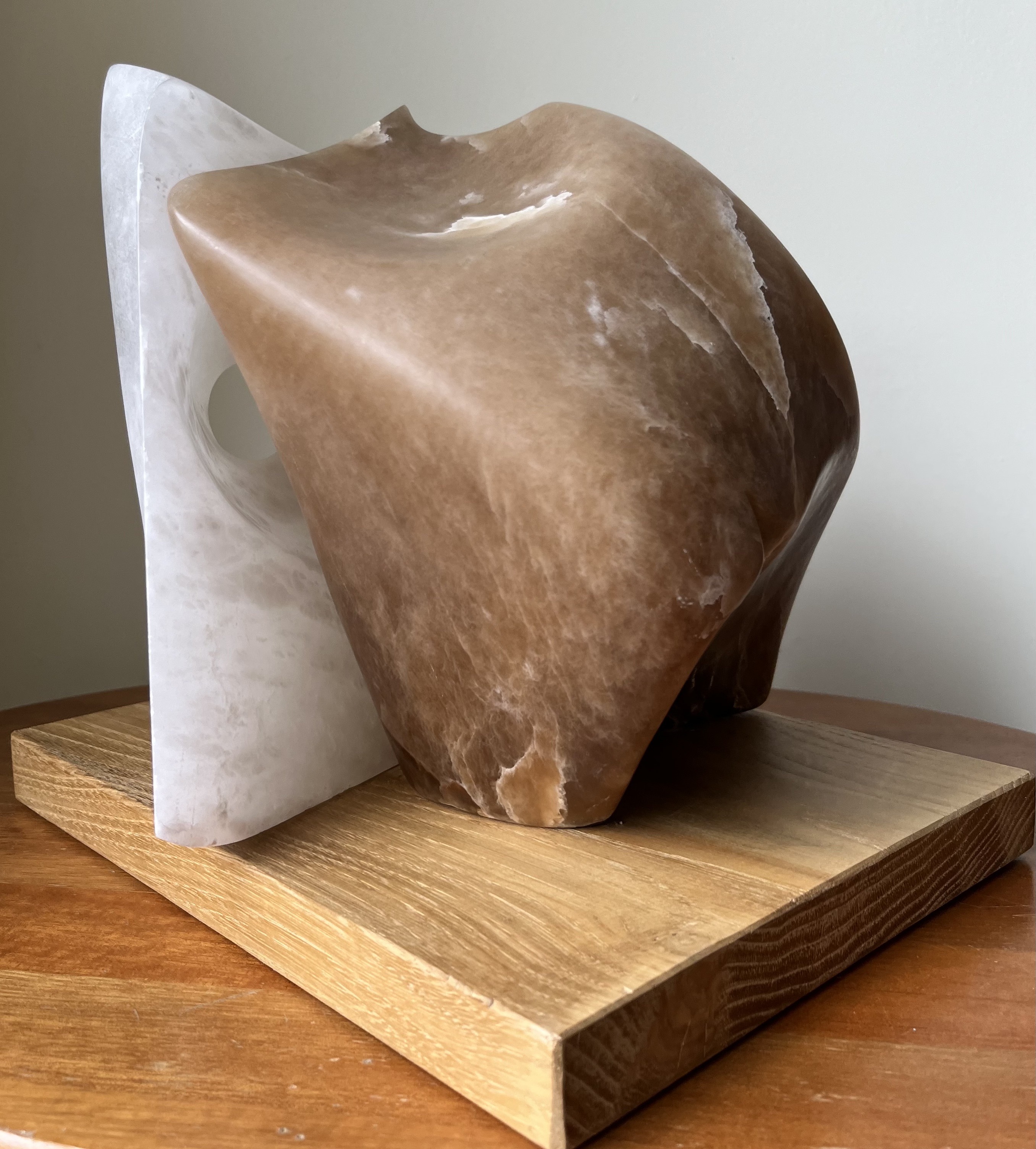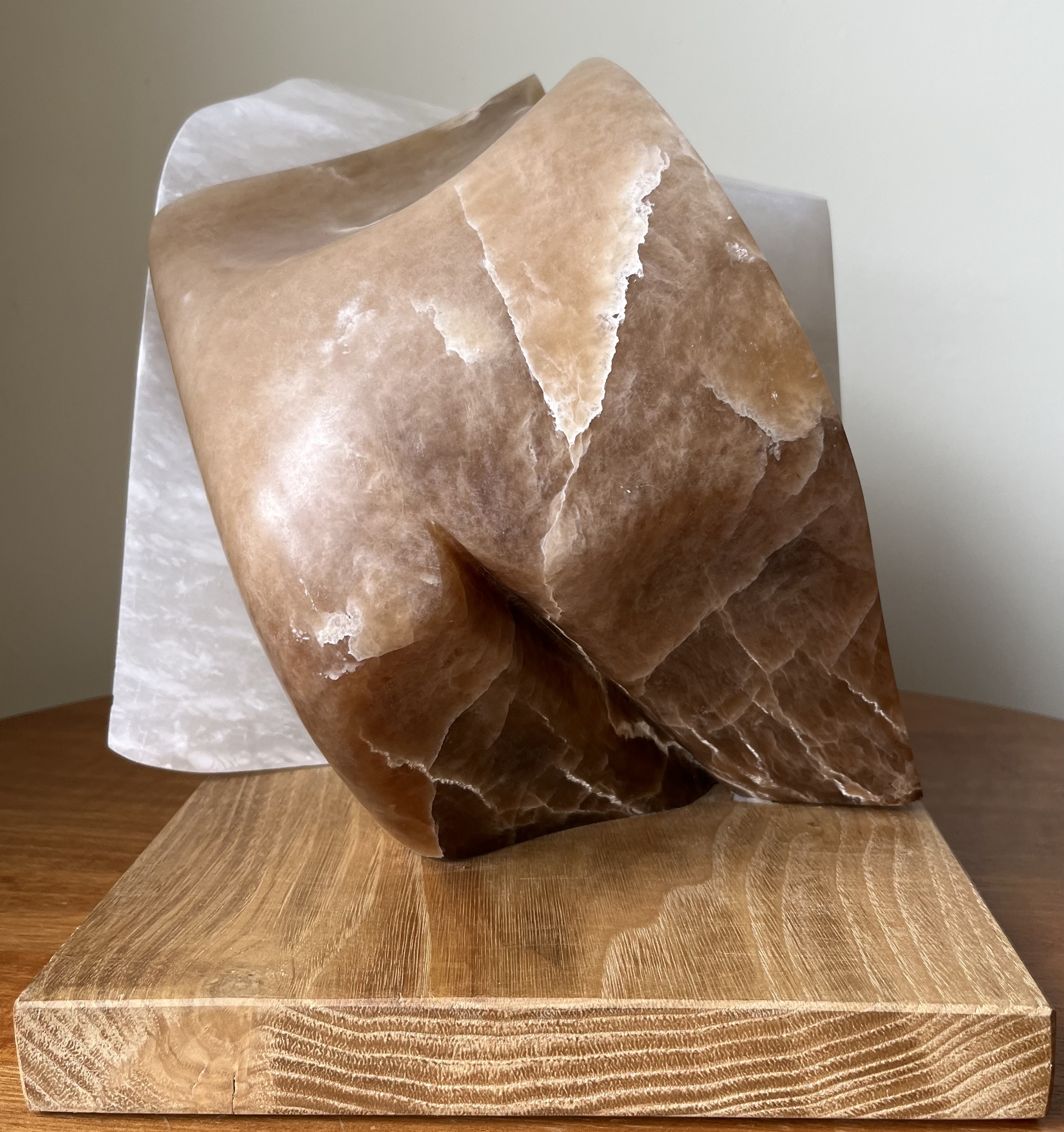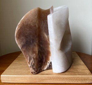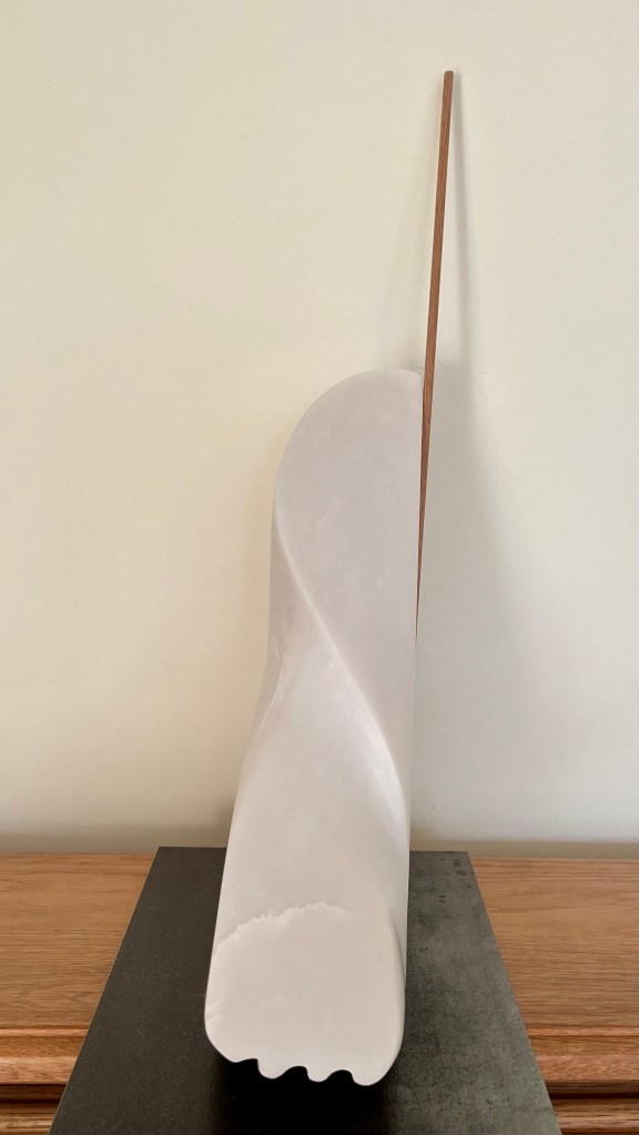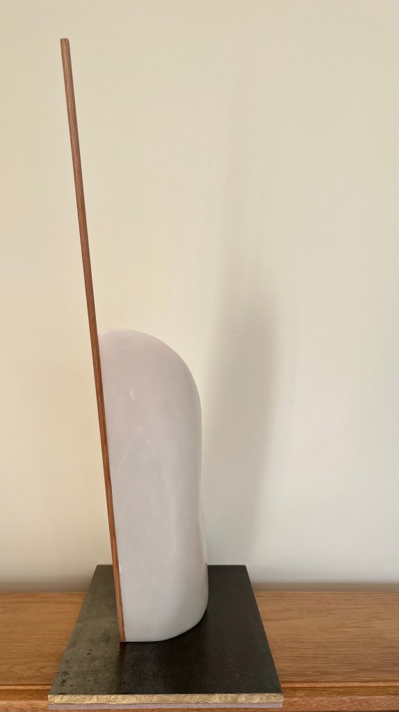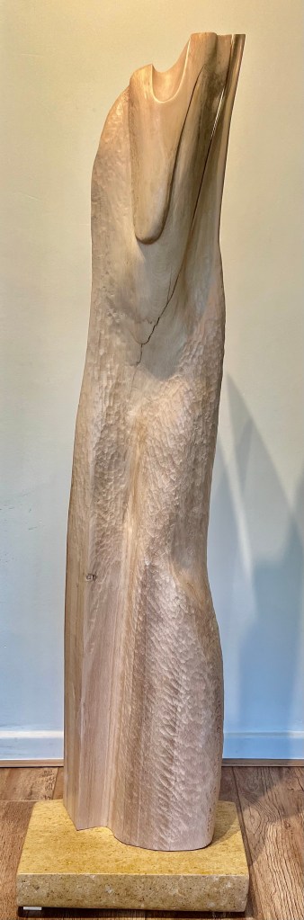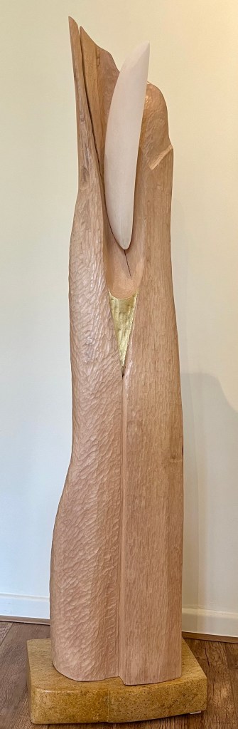 Augustus 2024 – Steen: witte albast met roze spikkels – Hout: tak van een beuk – Voet: acacia – Totale hoogte 112 cm