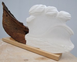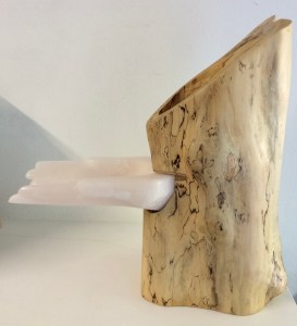 Zomer 2022 – De steen is een heldere roze albast. Het hout is een oude stam van een witte kastanje. De tekeningen in het hout zijn niet alleen van de boom zelf maar ook van de schimmels en van de insecten die het een extra leven hebben gegeven. Grootte: 48 (h) x 43 (b)