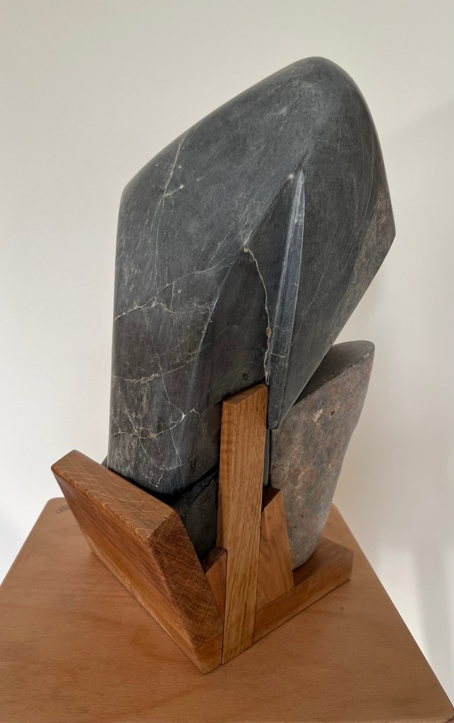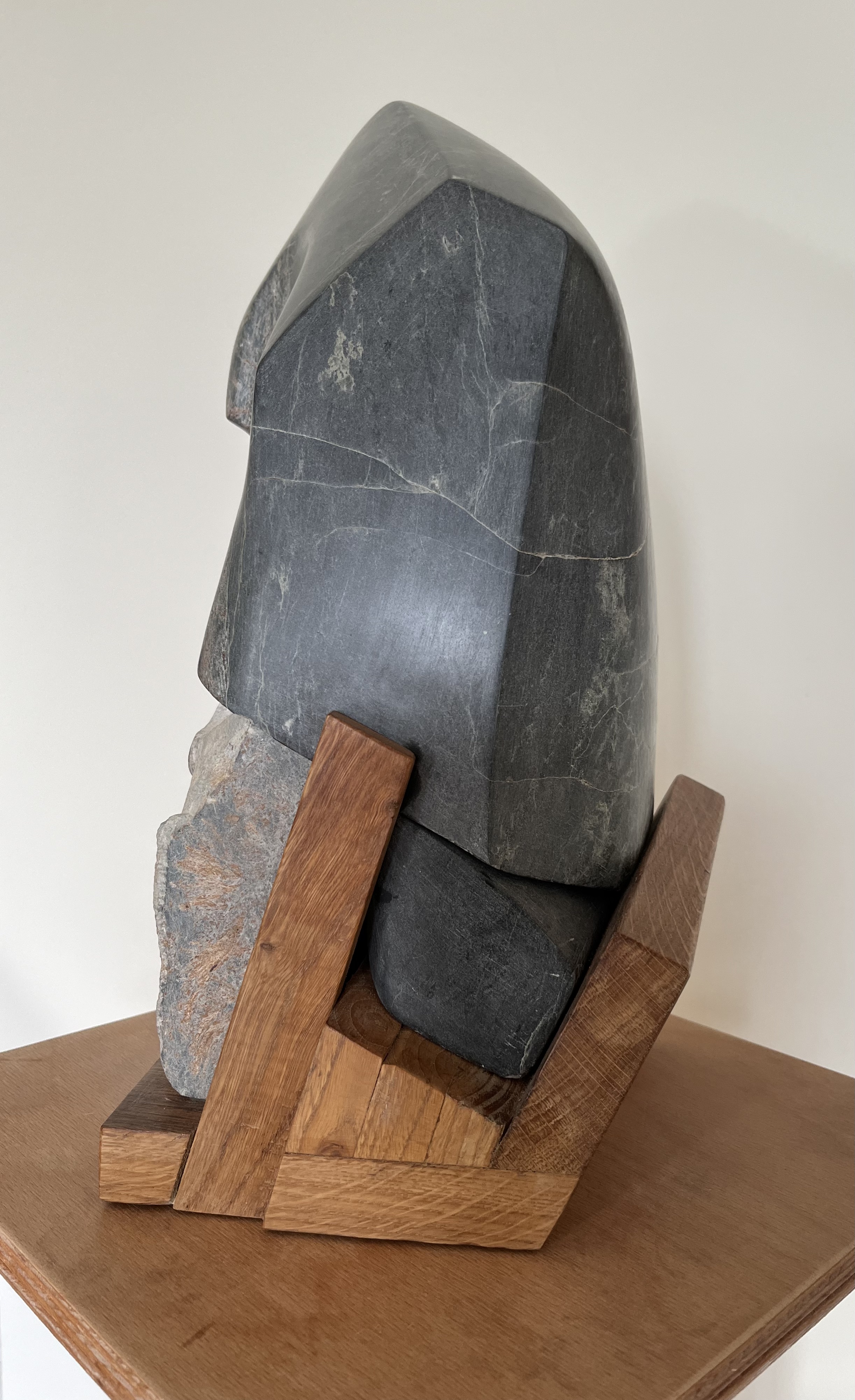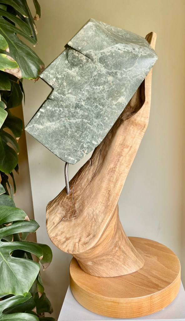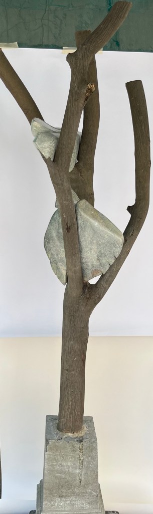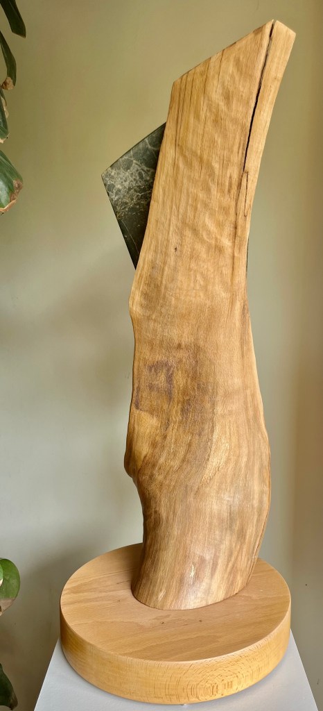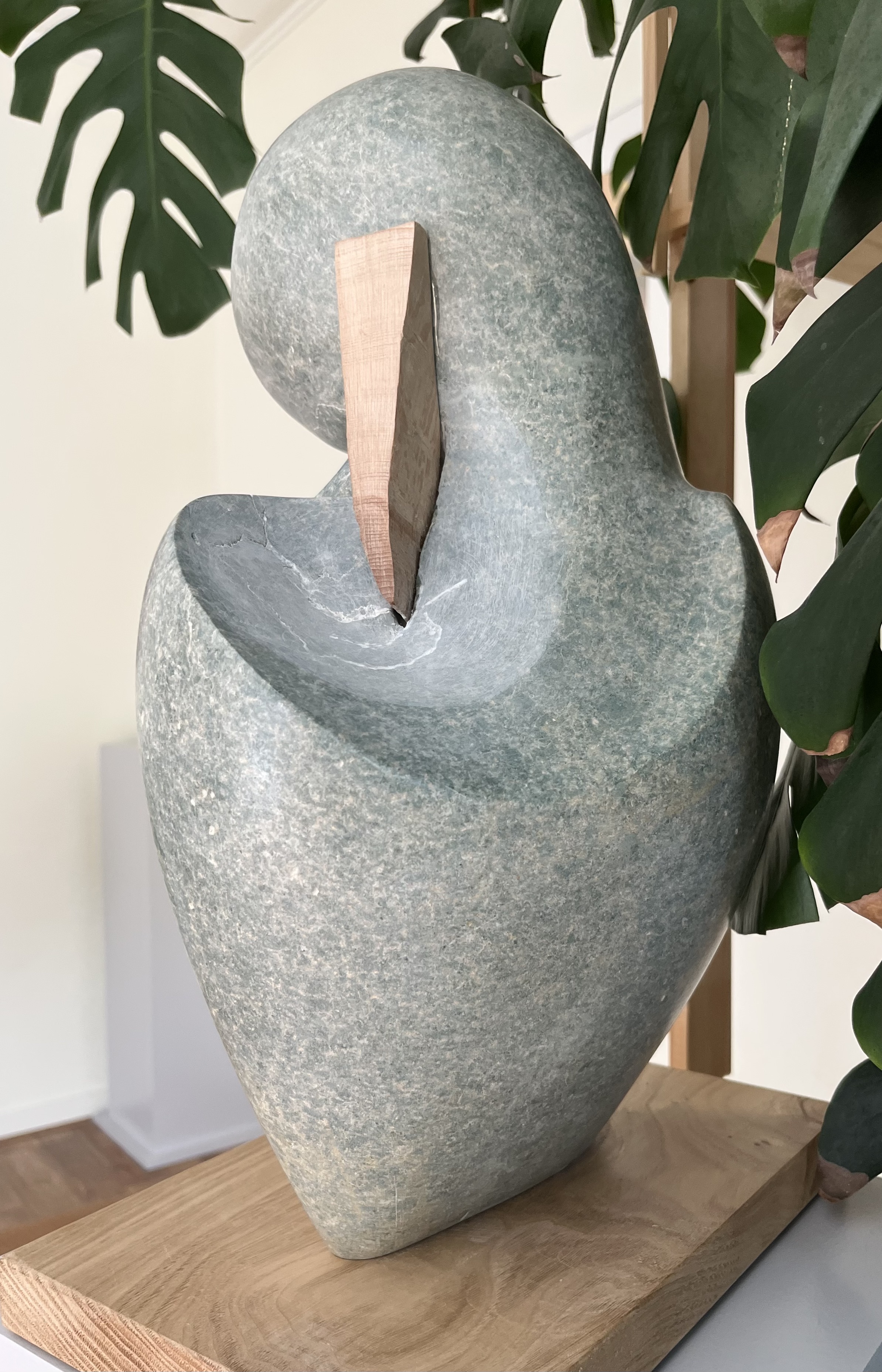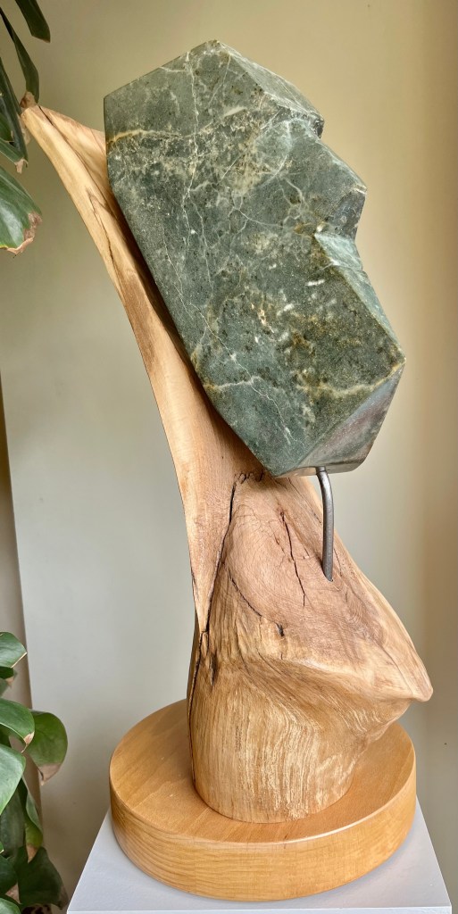 Juli 2024 – Steen: serpentijn – Hout: dikke tak van een beuk, van de buitenkant heb ik enkel de schors er af gehaald en voorzichtig geschraapt, dus zie je nog de bewegingen van de boom – totale hoogte 60cm + 5 cm voor de voet