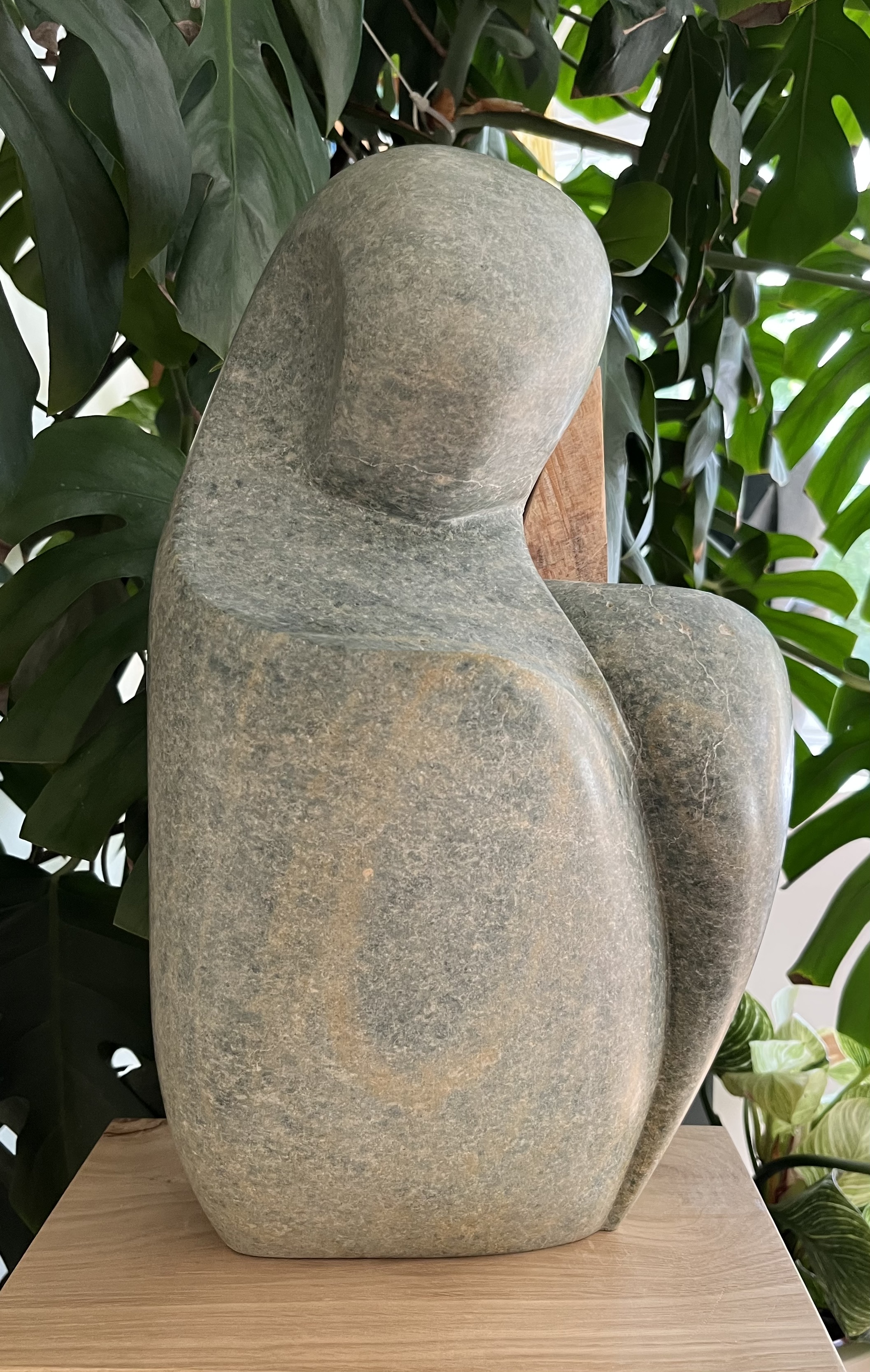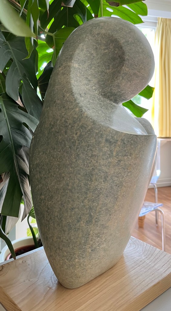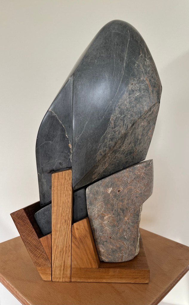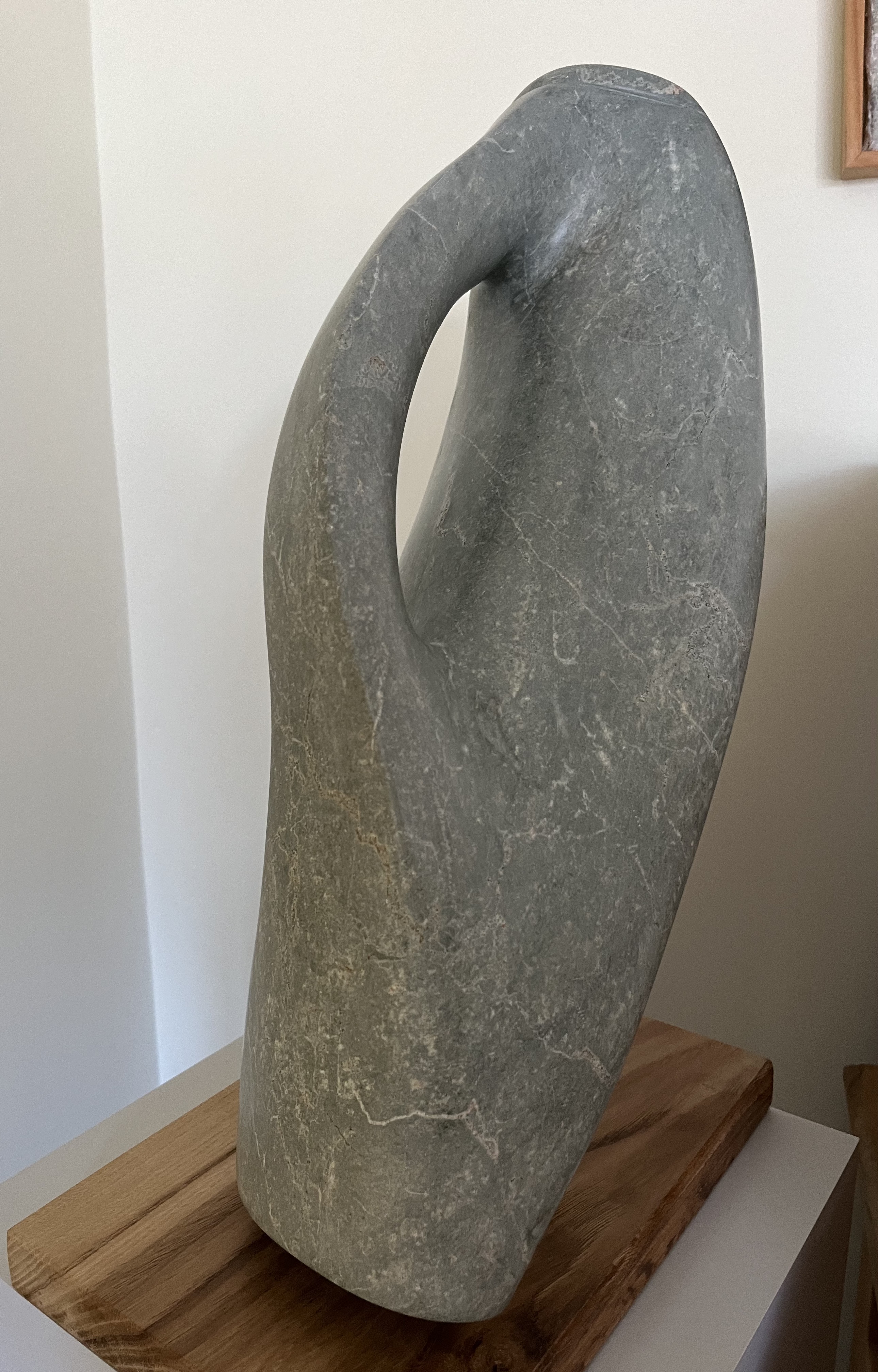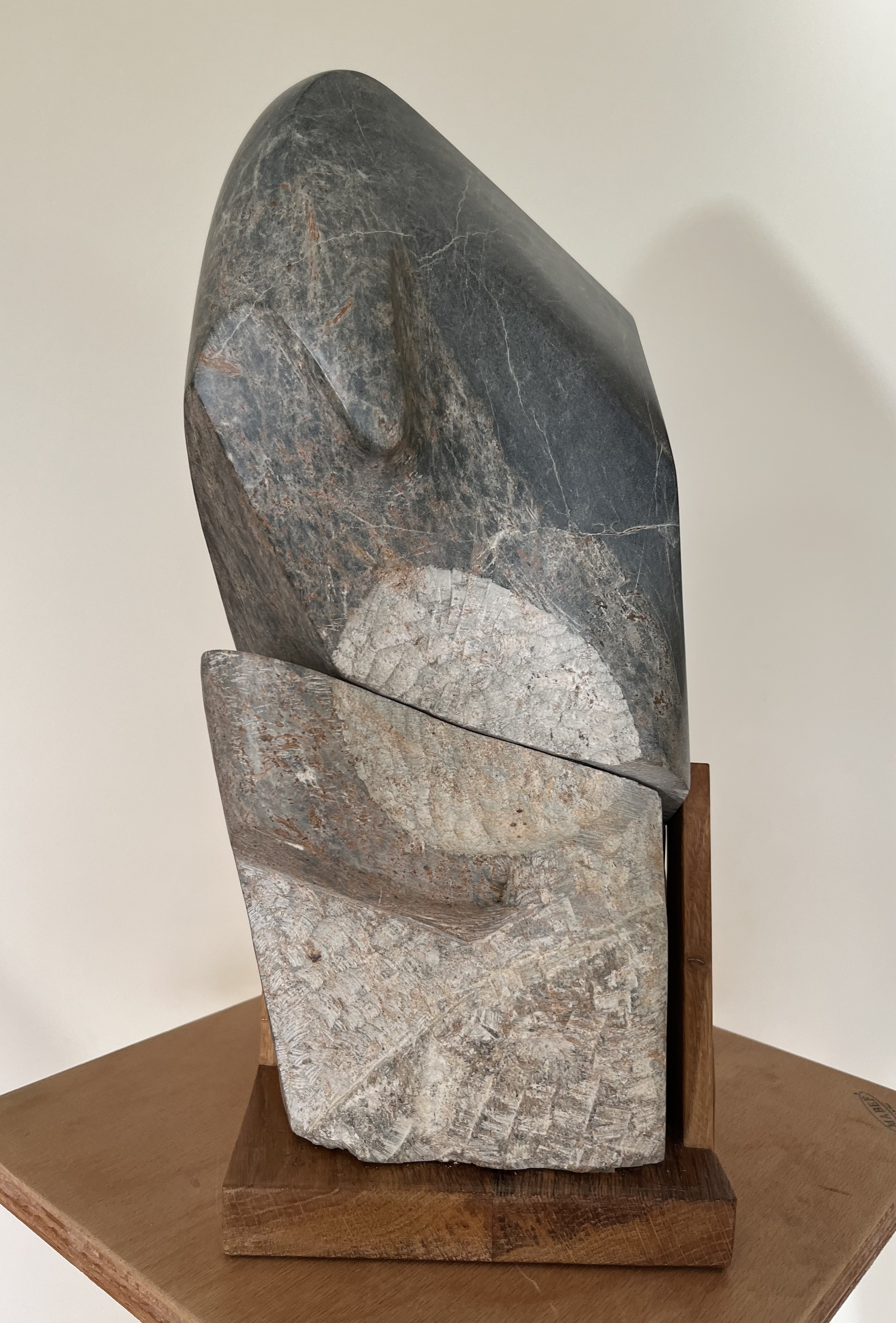Juli 2024 – Steen: serpentijn – Hout: dikke tak van een beuk, van de buitenkant heb ik enkel de schors er af gehaald en voorzichtig geschraapt, dus zie je nog de bewegingen van de boom – totale hoogte 60cm + 5 cm voor de voet