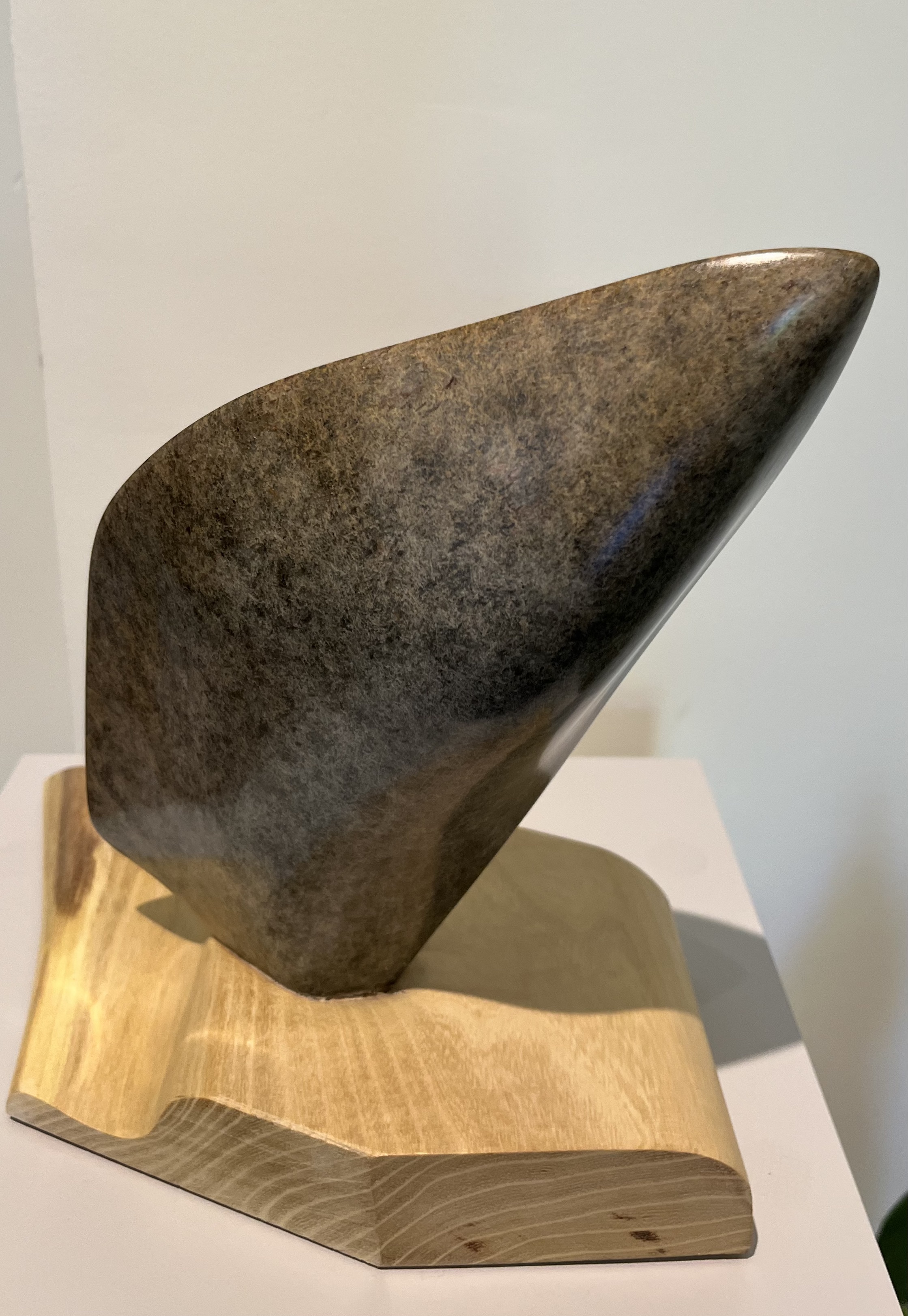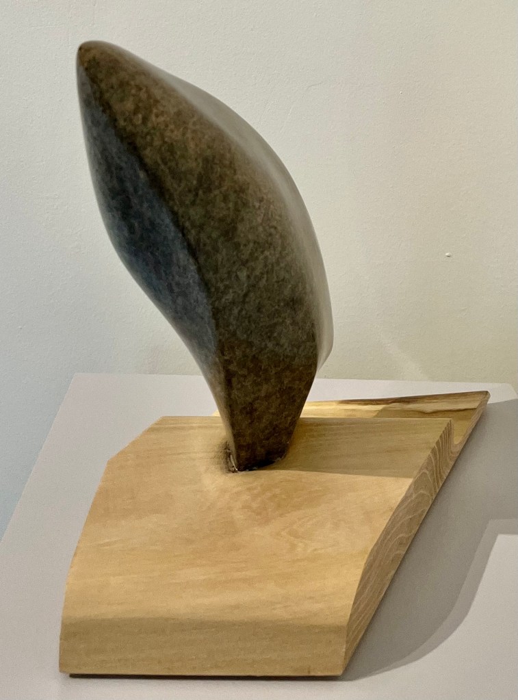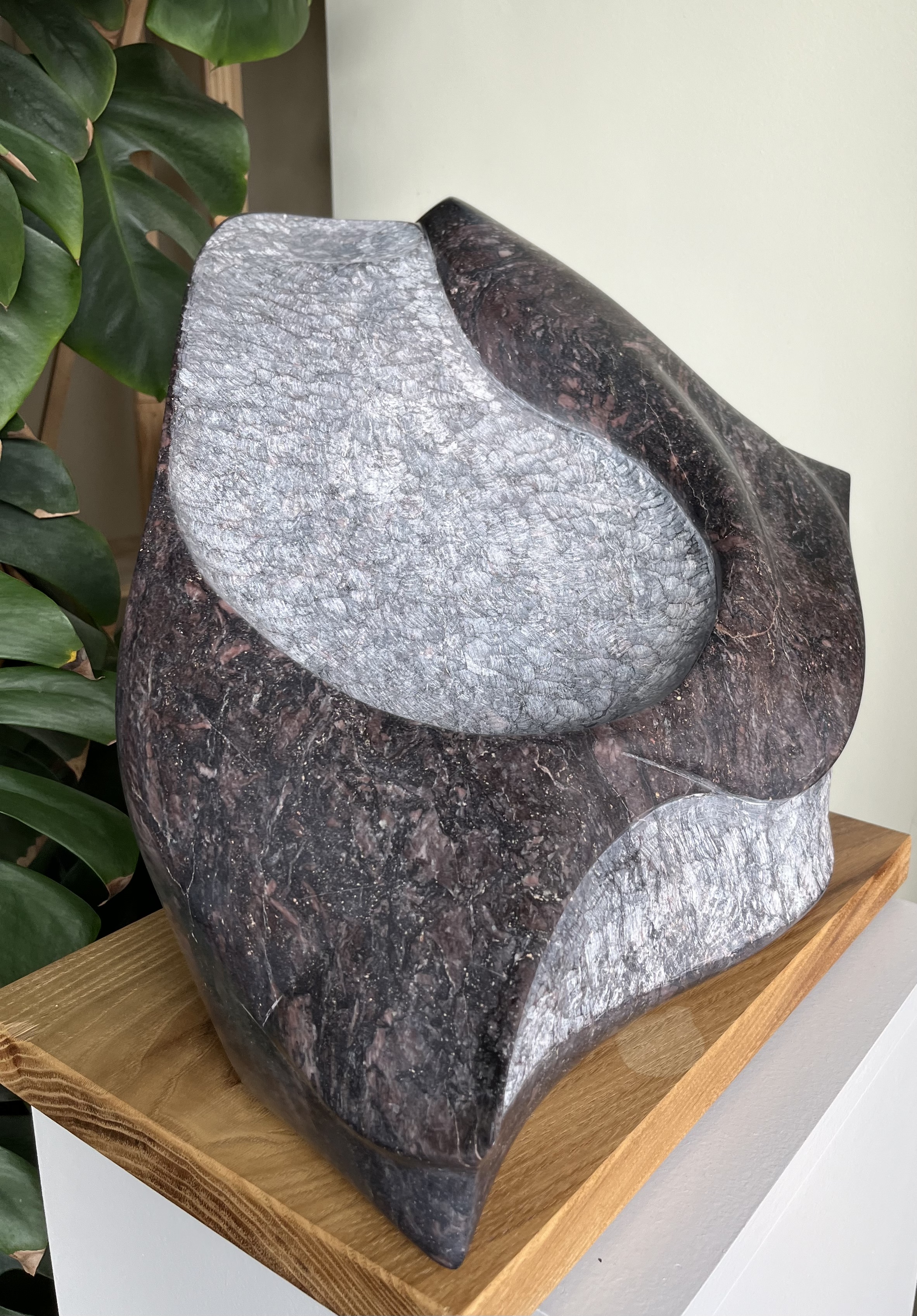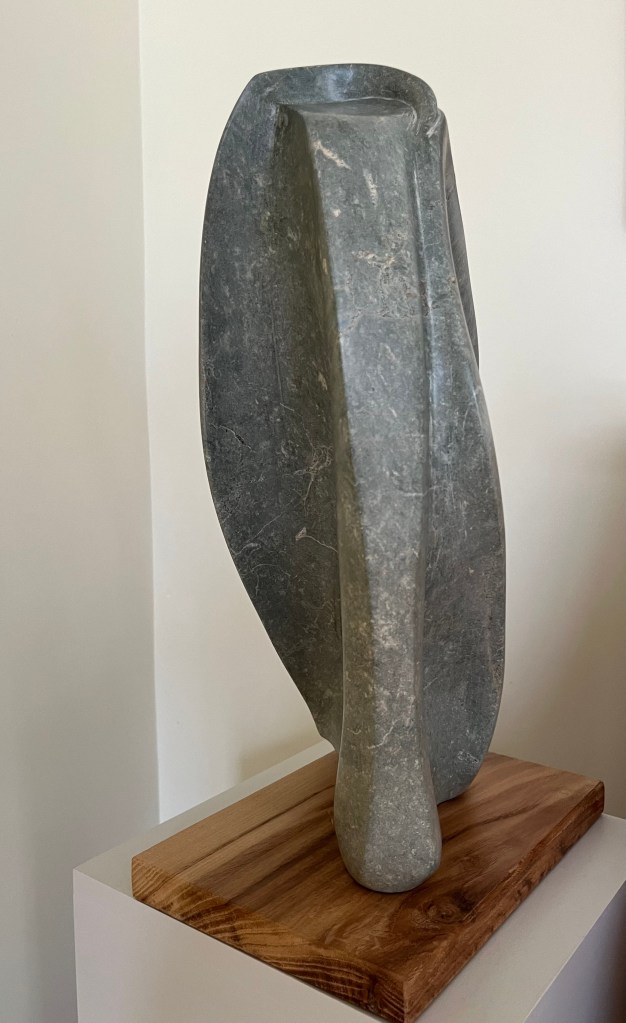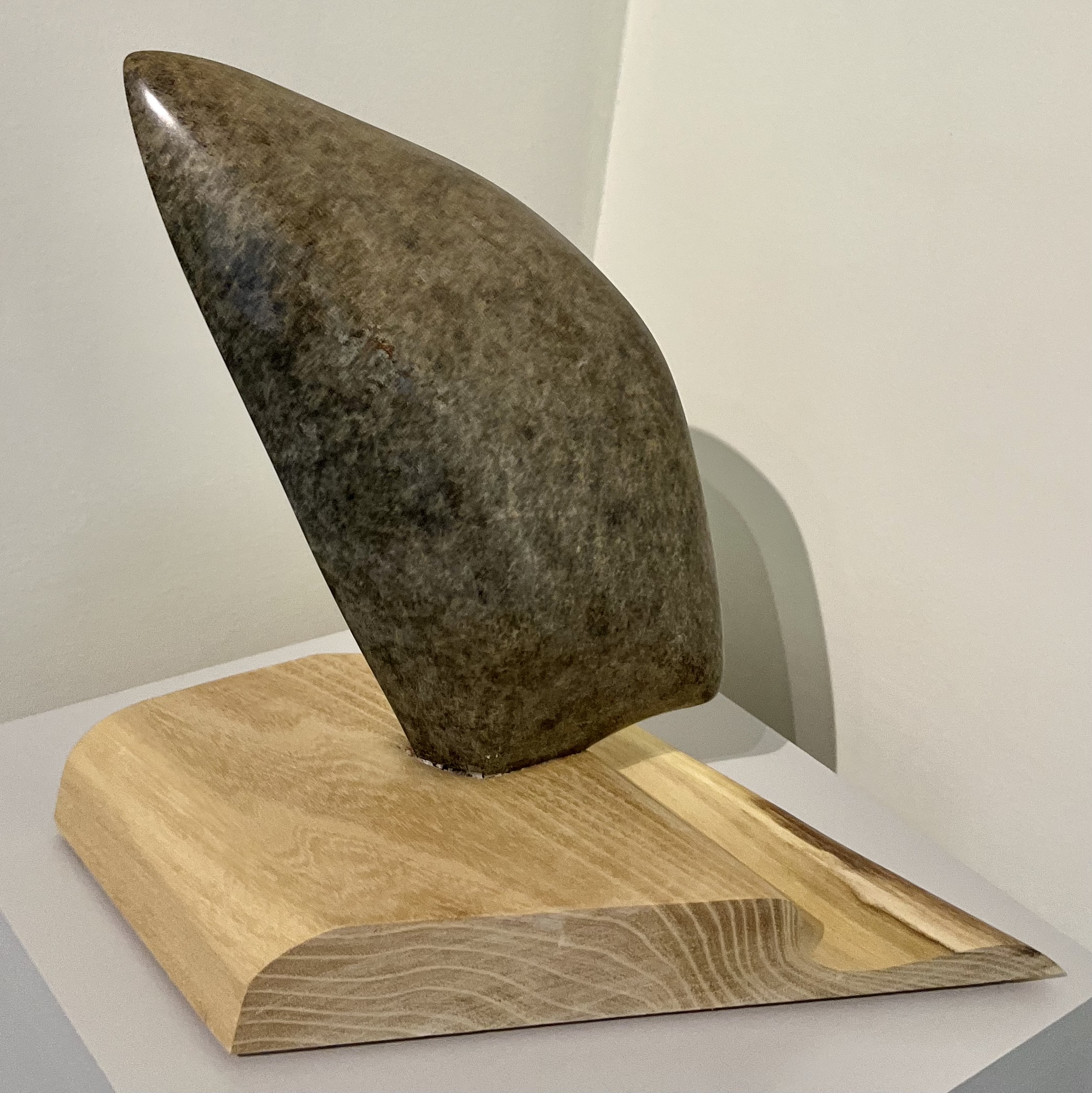 Juli 2024 – Steen: serpentijn – Hout: dikke tak van een beuk, van de buitenkant heb ik enkel de schors er af gehaald en voorzichtig geschraapt, dus zie je nog de bewegingen van de boom – totale hoogte 60cm + 5 cm voor de voet