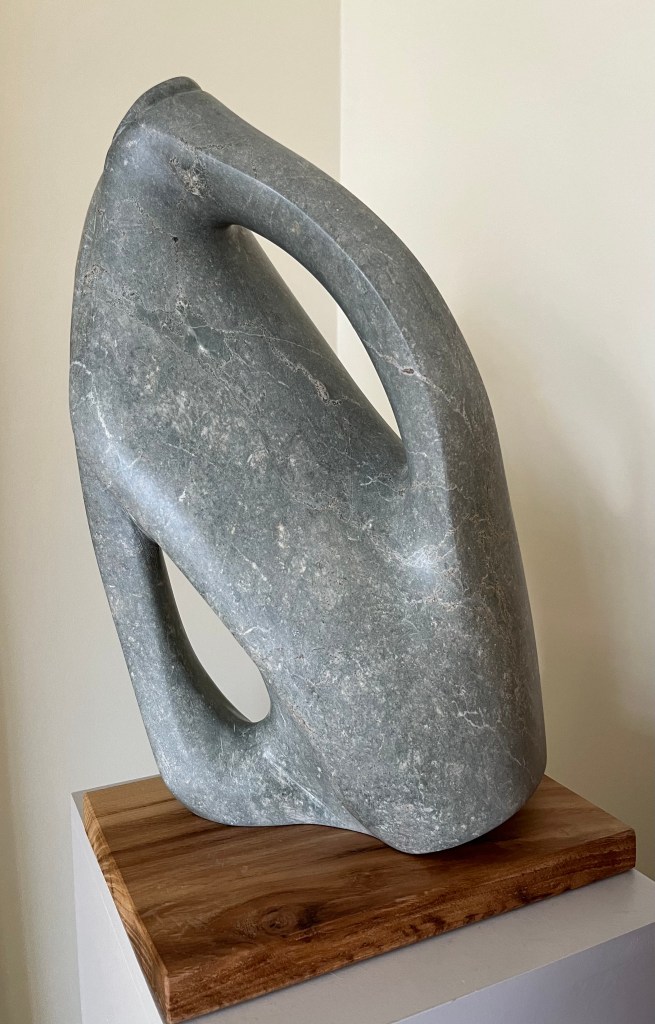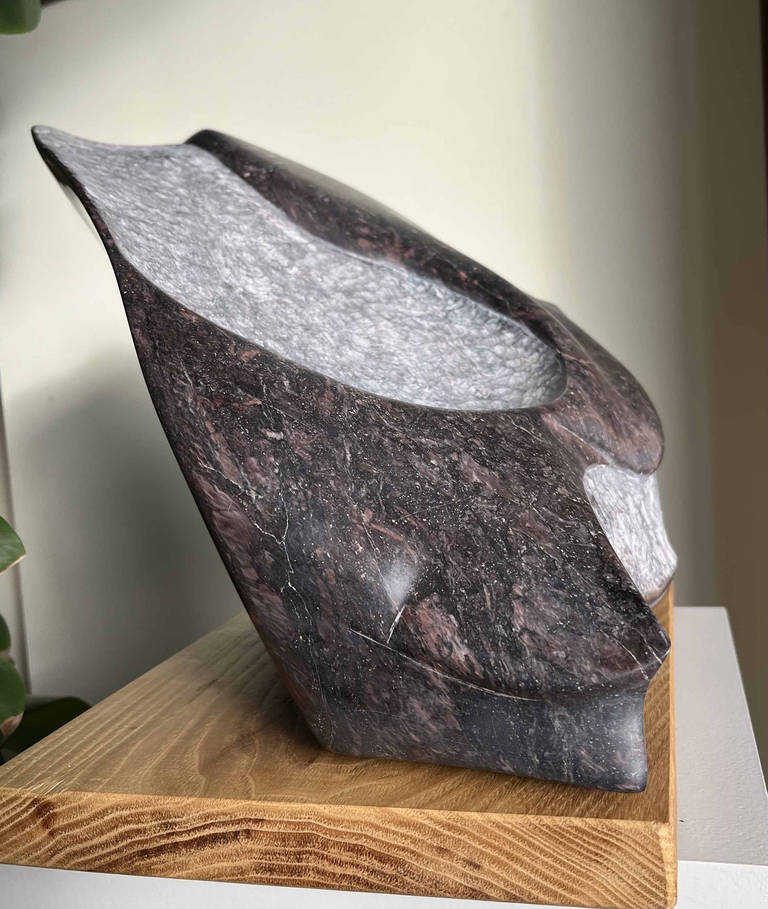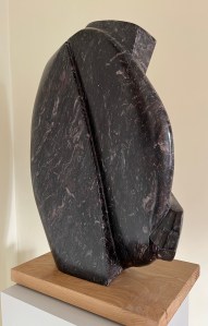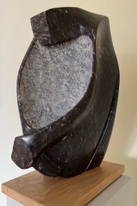 Een serpentijn – 43 cm hoog (sept.’21 – maart ’22) Wanneer ik er aan begon was het één steen, weliswaar vol barsten. Dat betekende voorzichtig kappen. Het voorste deel van de steen is broos omdat het wellicht eeuwen in het water heeft gelegen. Op een dag viel de steen uiteen in drie grote stukken en nog wat kleinere. Ik heb toen een voet gemaakt die hem terug tot een geheel kon brengen. De steun is deel van het beeld.